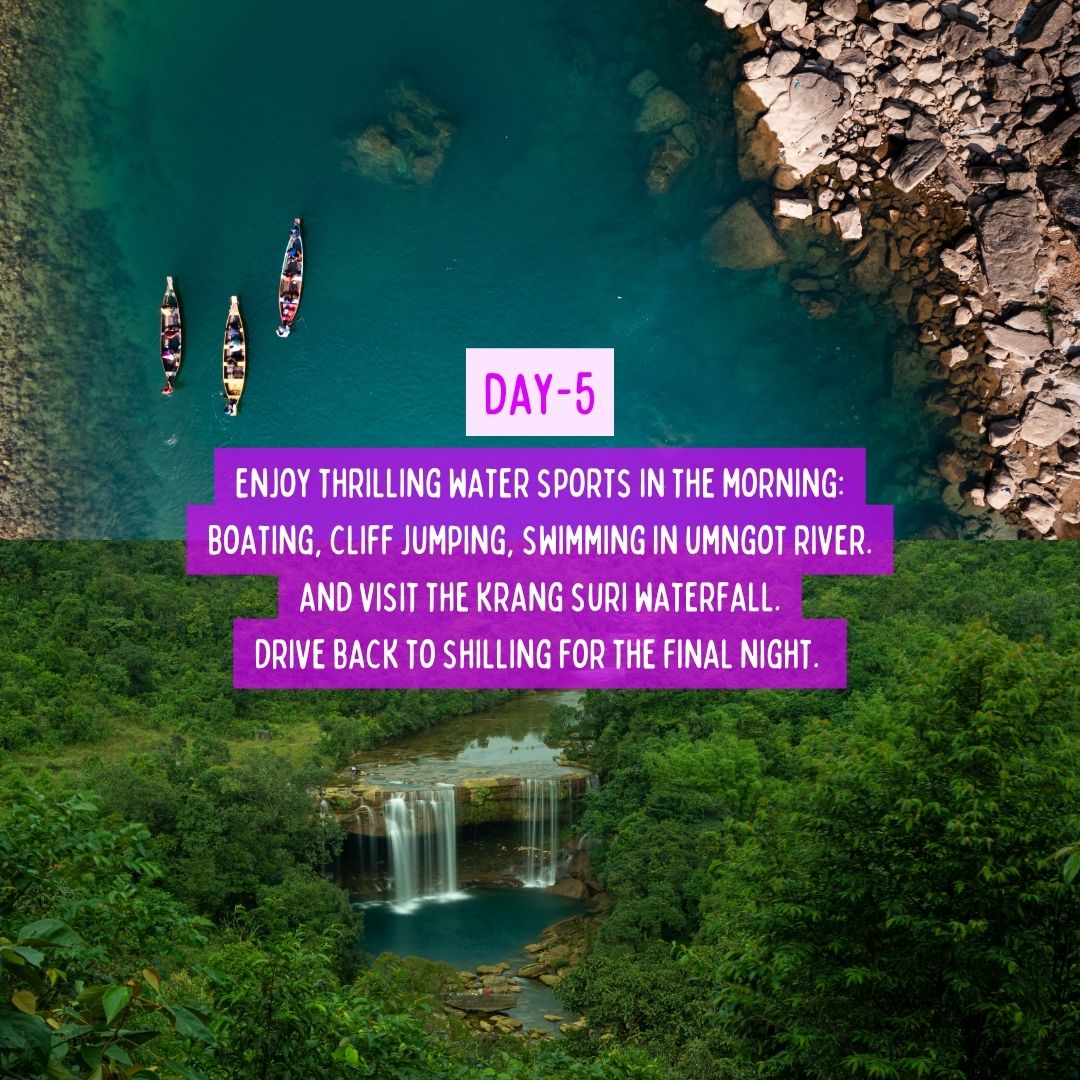 - Later, visit Krang Suri Waterfall, one of Meghalaya’s most beautiful yet less crowded waterfalls — perfect for a refreshing dip or simply relaxing