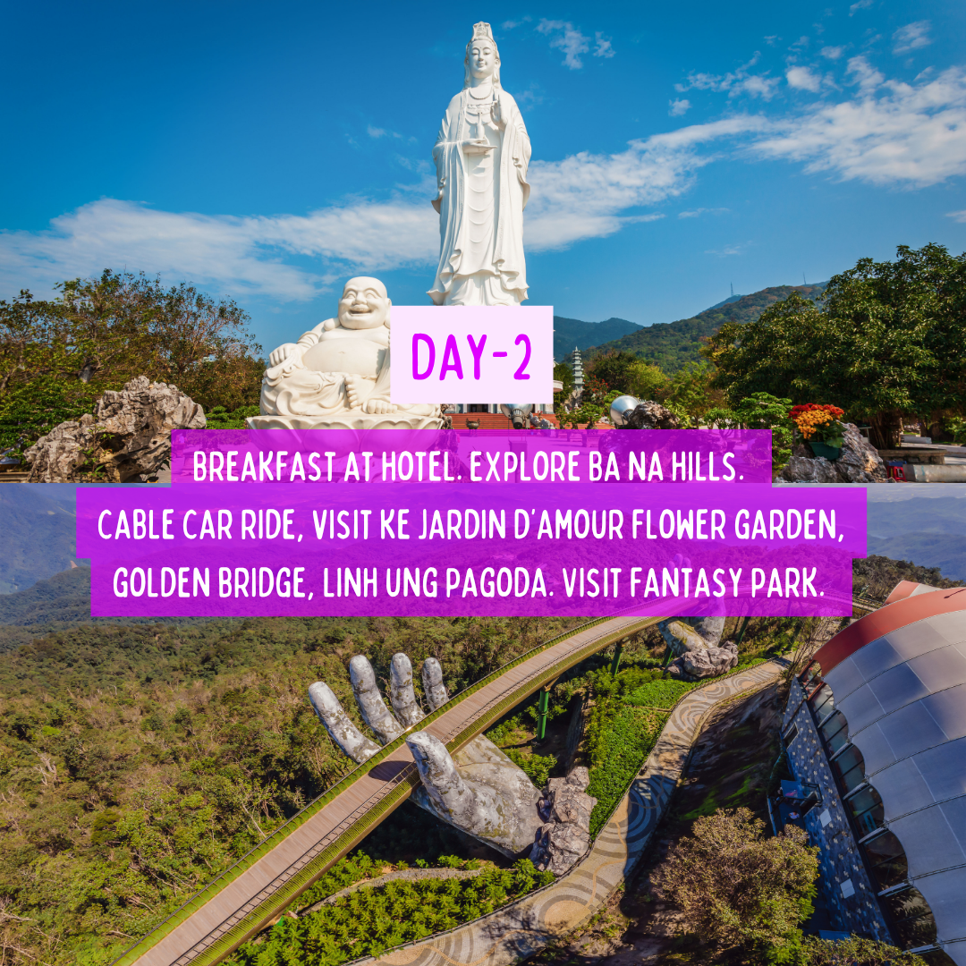 - Ba Na Hills: Cable car ride, visit Le Jardin D’Amour Flower Garden, Golden Bridge, Linh Ung Pagoda (tallest Buddhist statue in Vietnam).