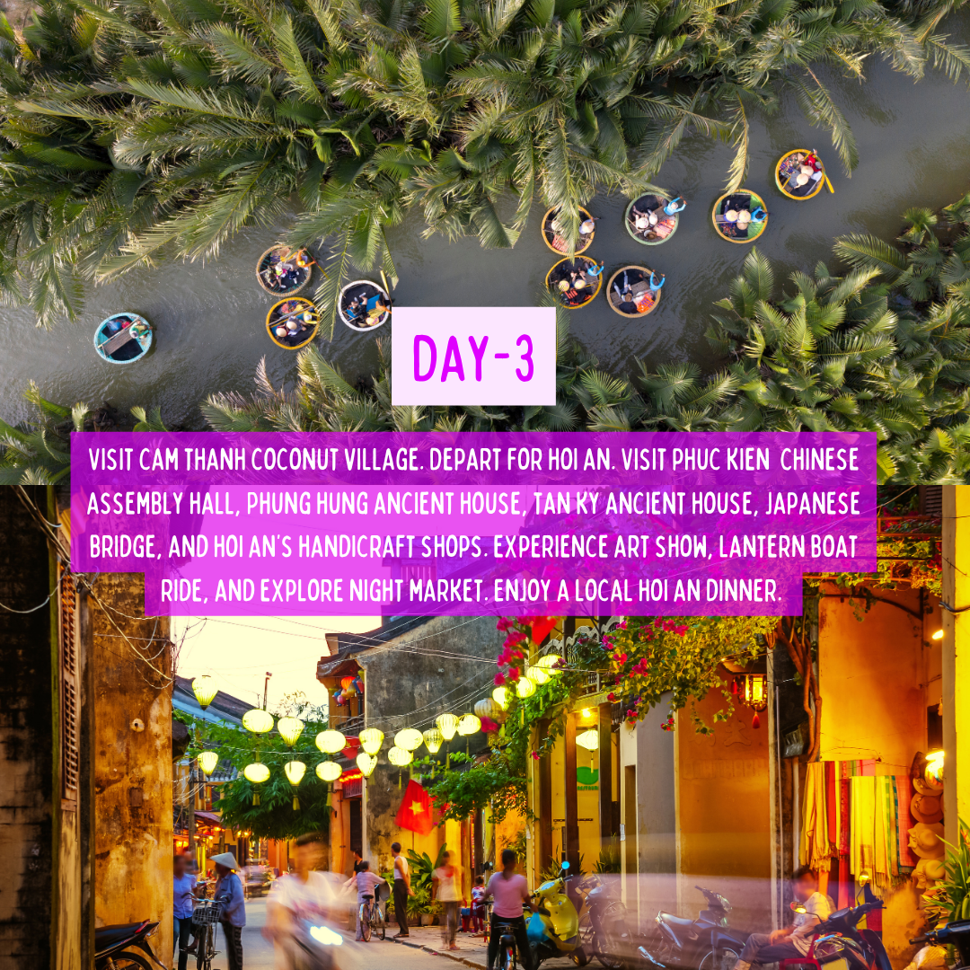 - Depart for Hoi An: Visit Phuc Kien Chinese Assembly Hall, Phung Hung Ancient House, Tan Ky Ancient House, Japanese Bridge, and Hoi An's handicraft shops.