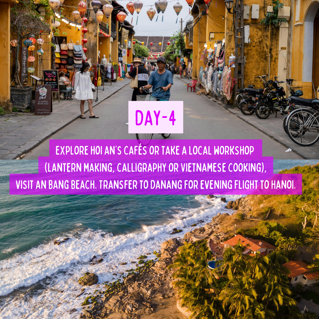 - Free time to explore more of Hoi An’s cafes, shops, or take a local workshop (e.g., lantern making, calligraphy, or Vietnamese cooking).