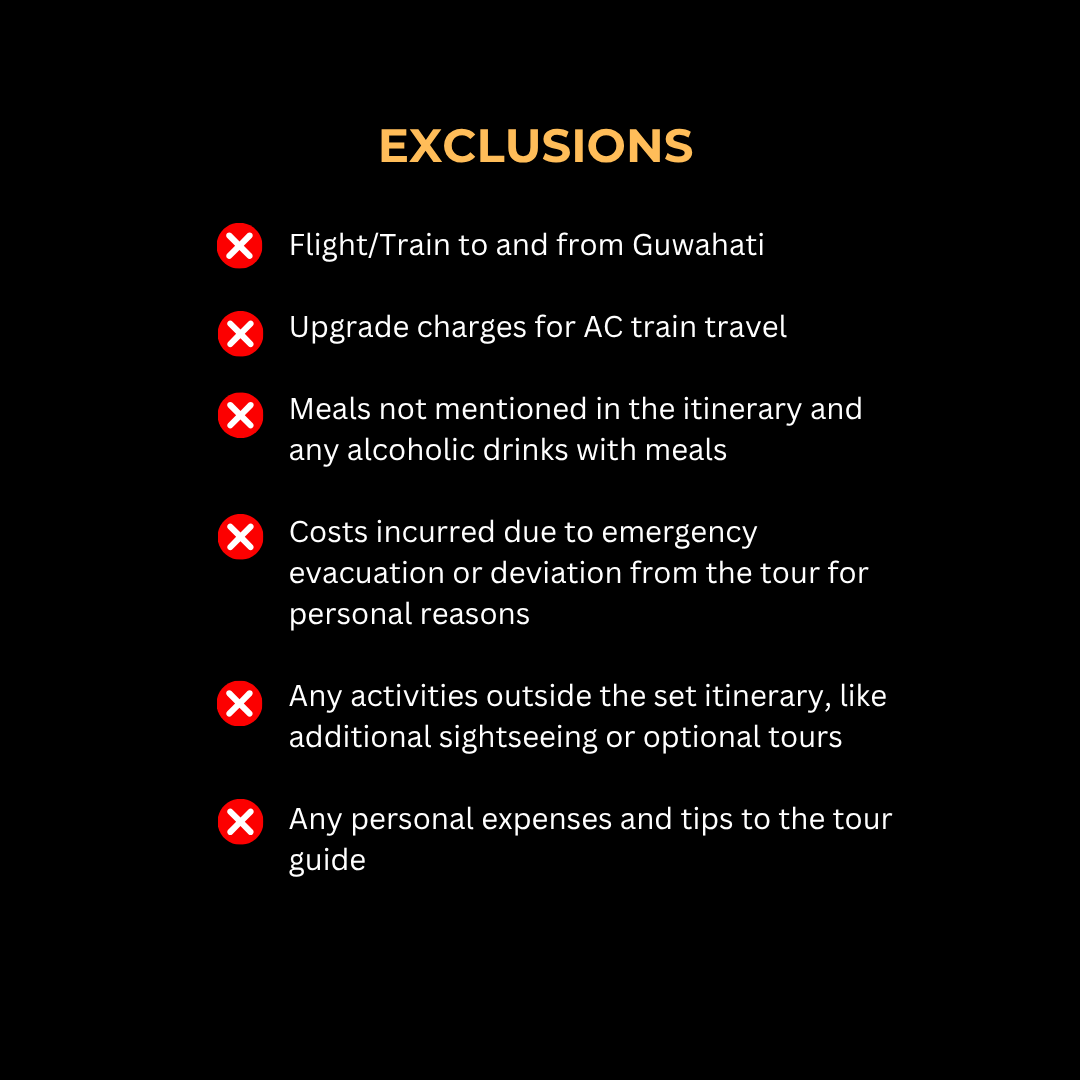 - 2 nights onboard train (Guwahati–Naharlagun–Guwahati, sleeper class)