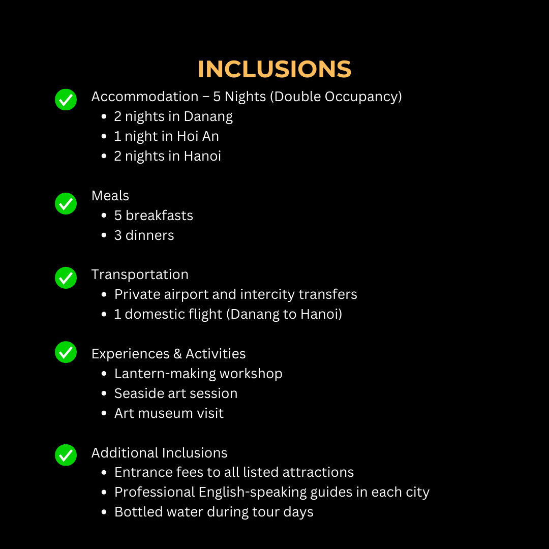 - Ease into your Vietnam journey with a gentle art session by the sea, where soft brushstrokes meet the turquoise waters of My Khe — a perfect moment of calm and creativity.