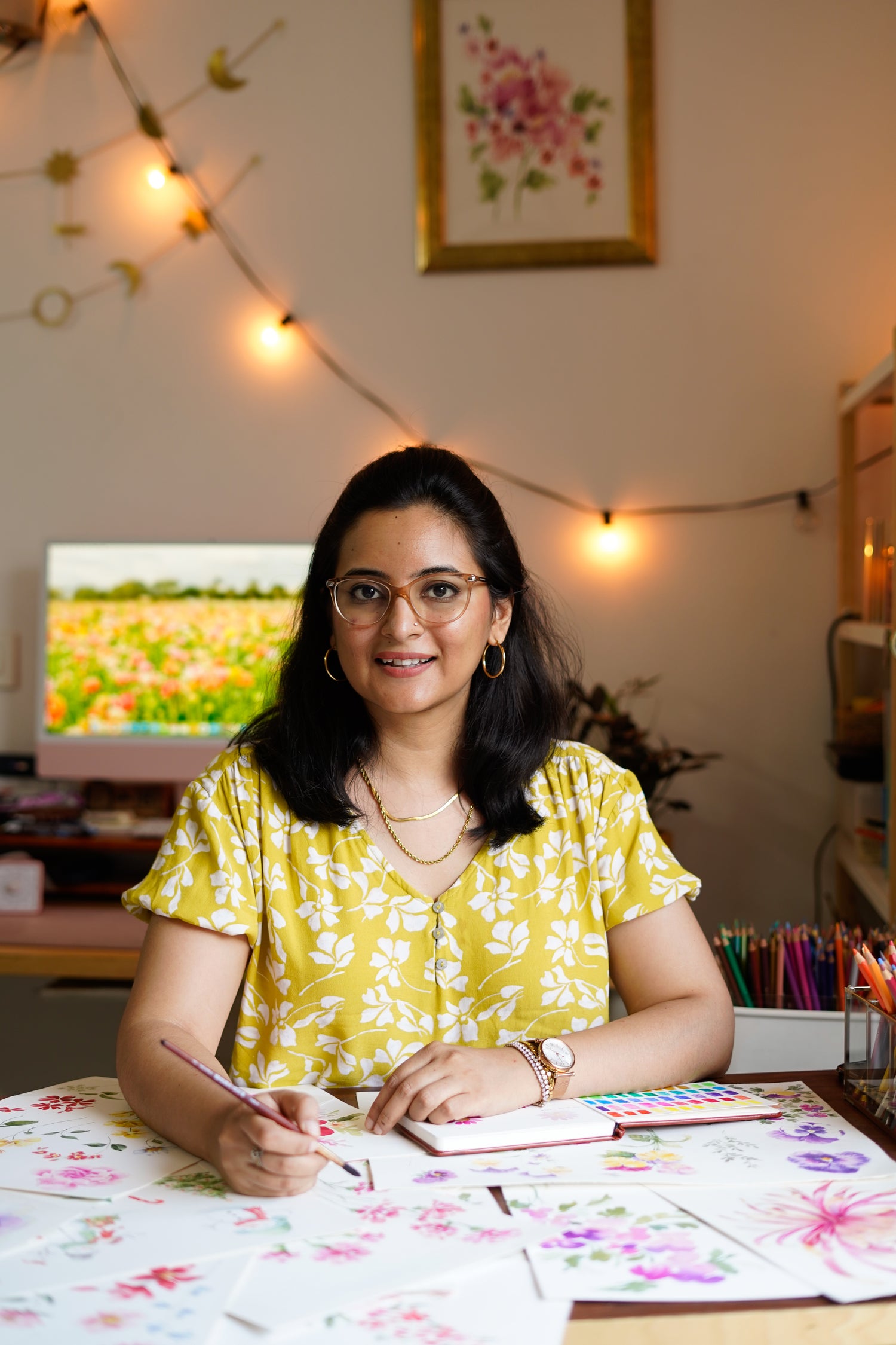 Manushree Mishra is a self-taught watercolor artist, surface pattern designer, author, and creative educator based in Delhi, India. With a background in software development and UX design, she brings a structured yet soulful approach to her art — combining problem-solving, visual thinking, and a love for beauty in equal measure. Over the past seven years, she’s built a thriving art practice focused on watercolor florals, color theory, and nature-inspired storytelling. Her mission is simple yet powerful: to help others reconnect with their creative voice and find joy in the everyday act of making. Manushree is the author of Contemporary Color Theory and Watercolor Flowers and has taught over 50,000 students around the world through her in-person workshops and creative classes. Her approachable, generous teaching style is beloved by students of all levels — because she meets people where they are, celebrates their individuality, and teaches from a place of genuine encouragement. Through her watercolor work and creative guidance, she helps others build confidence, explore their unique style, and fall in love with the process of painting. Follow her on Instagram @thewhimsicalcreative or visitthewhimsicalcreative.comto learn more.