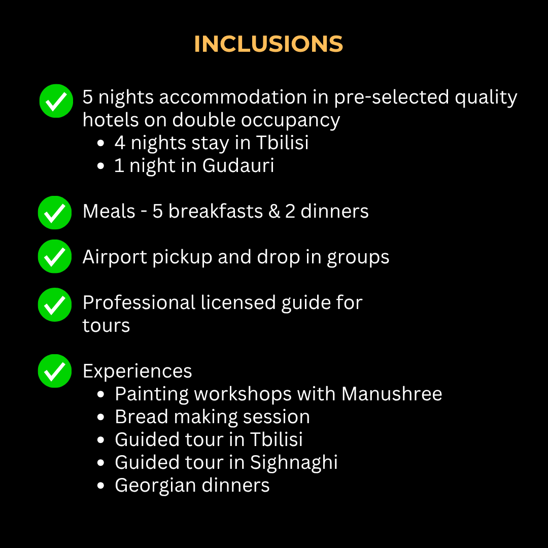 - Arrive at Tbilisi International Airport, where you'll be greeted and transferred to your hotel. The flight from India typically lands very late at night ( 2 am)