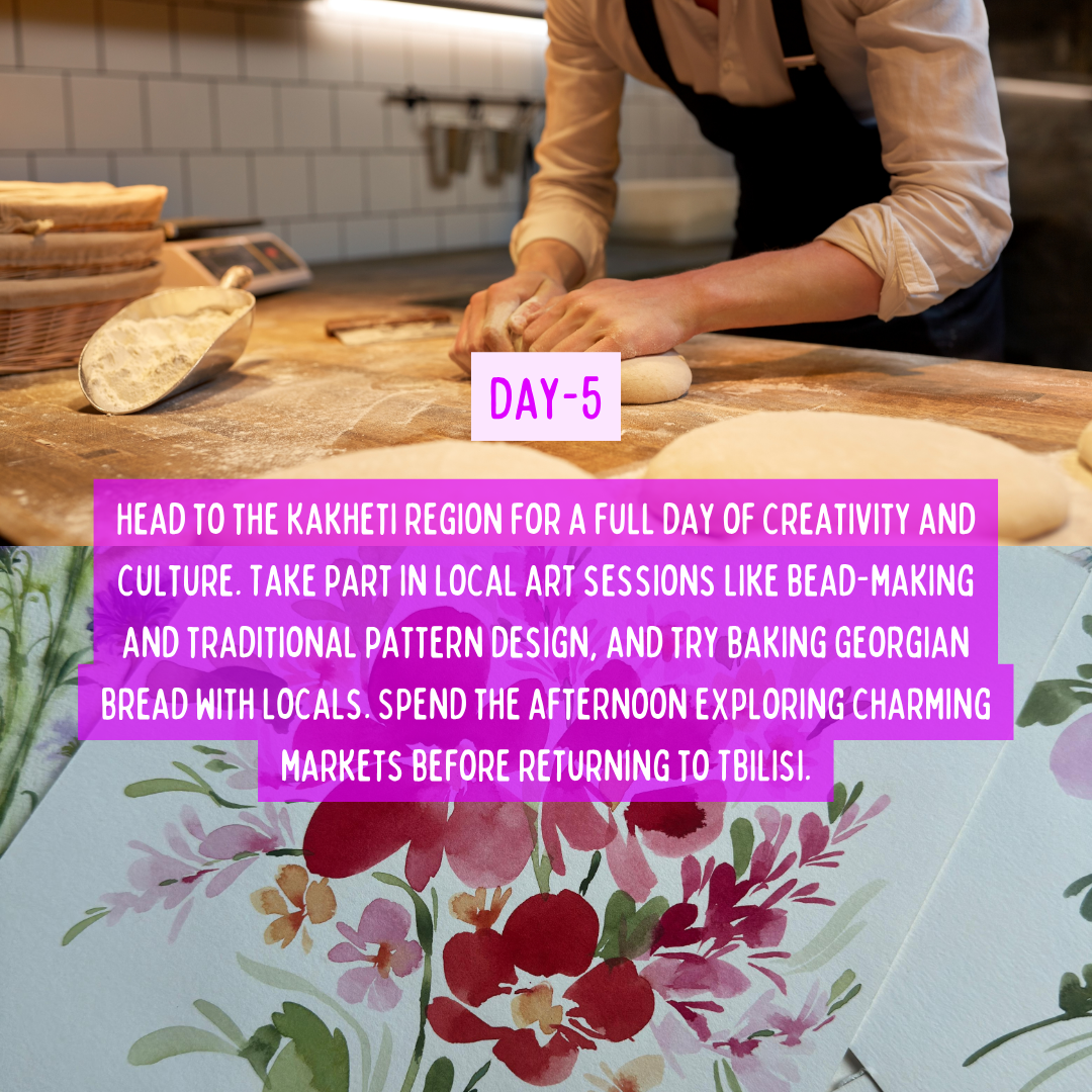 After the session, take a leisurely stroll around the town, visiting local craft markets for unique handmade souvenirs.Return to Tbilisi in the evening and enjoy free time to explore at your leisure.