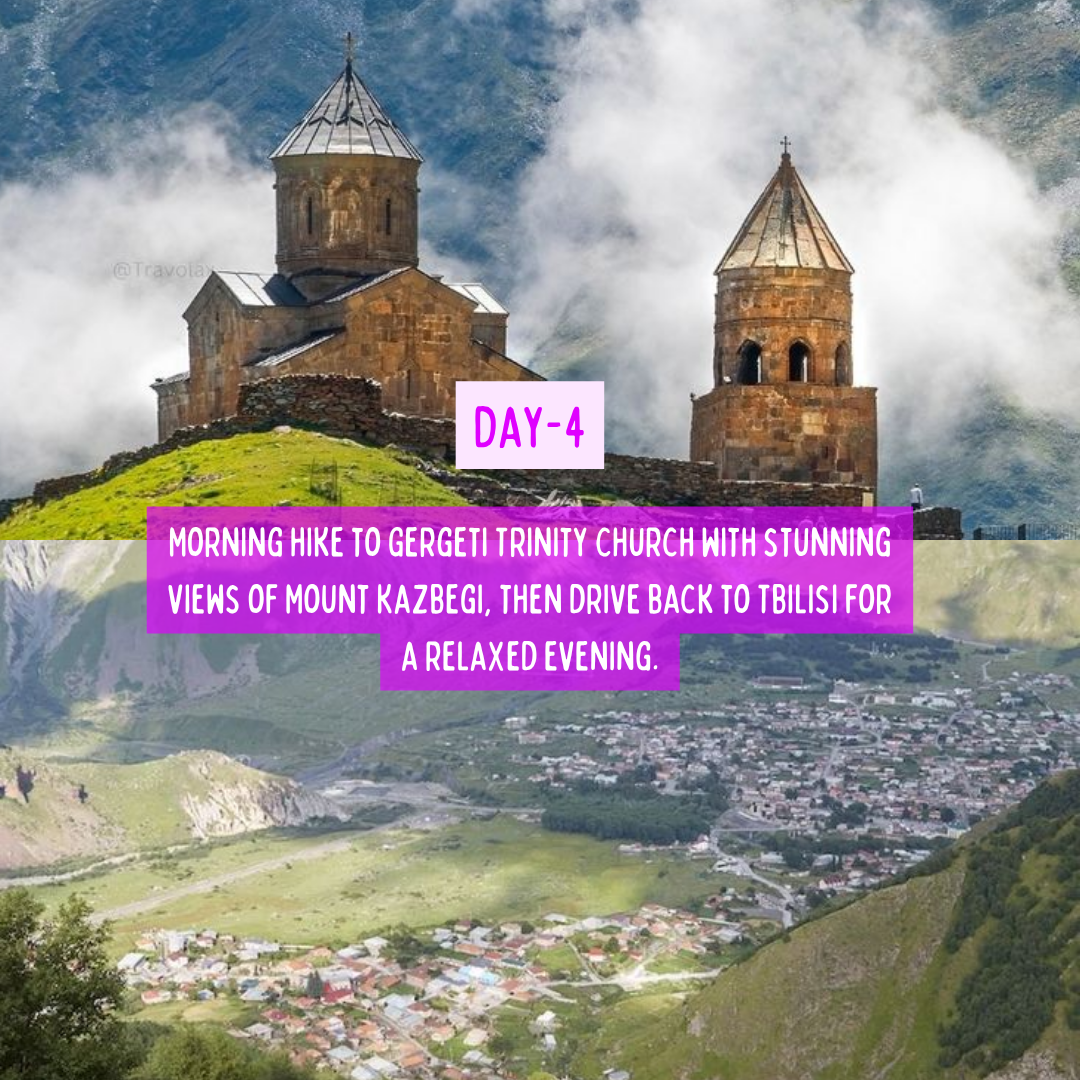 - Trinity Church: Go on a hike to Gergeti Trinity Church, a stunning 14th-century monastery perched at 2,170m, offering breathtaking views of Mount Kazbegi.