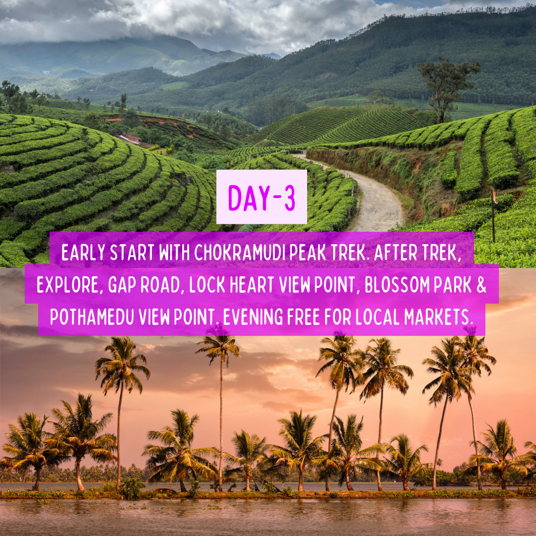 Adventures & Leisure: Whether you prefer a rewarding trek up Chokramudi Peak, a gentle boat ride on Kundala Lake, or simply relaxing with a cup of tea amidst the hills, this journey offers a perfect blend of adventure and relaxation.