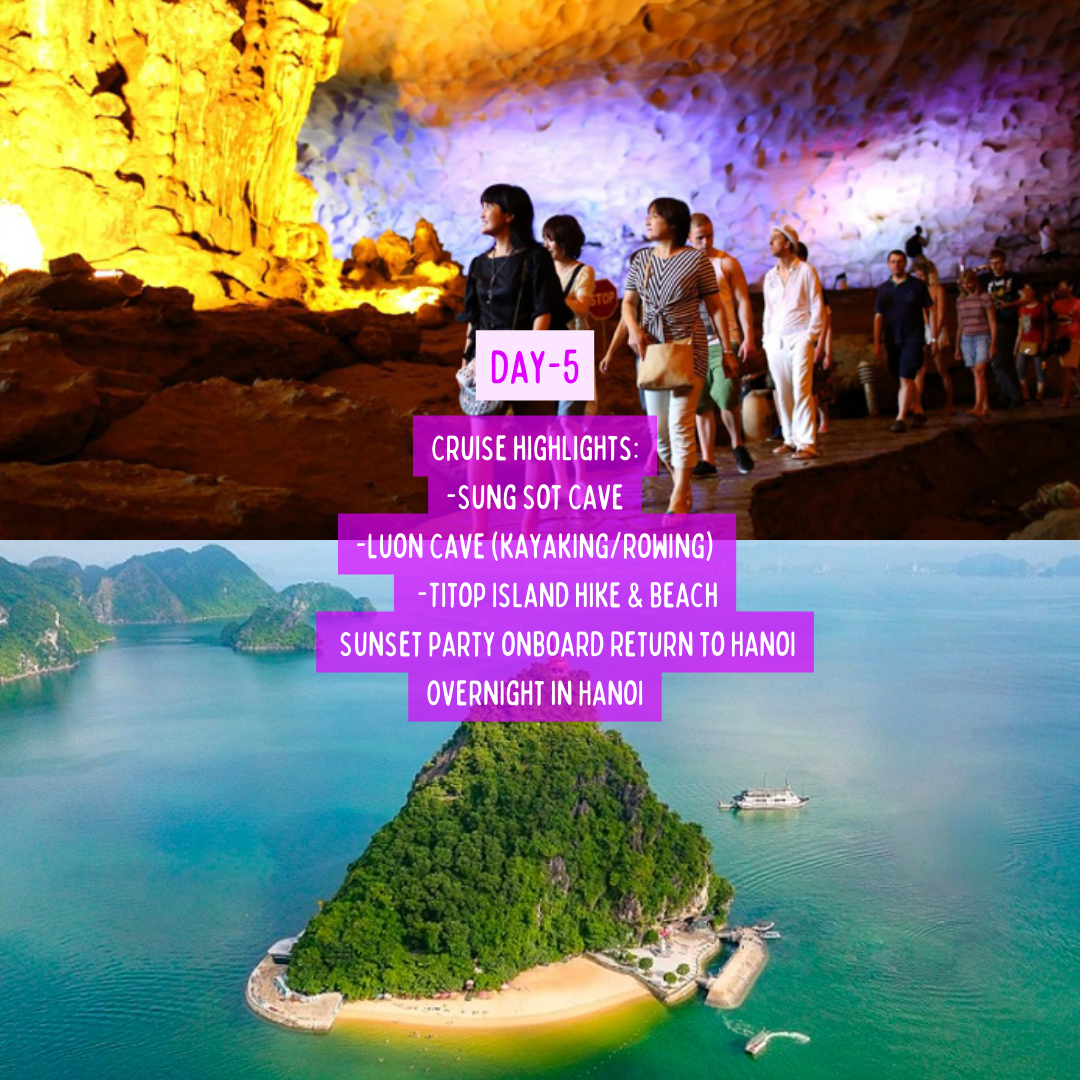 Enjoy a sunset party onboard with red wine, fruit, snacks, and views to remember. Return to Hanoi by late evening.