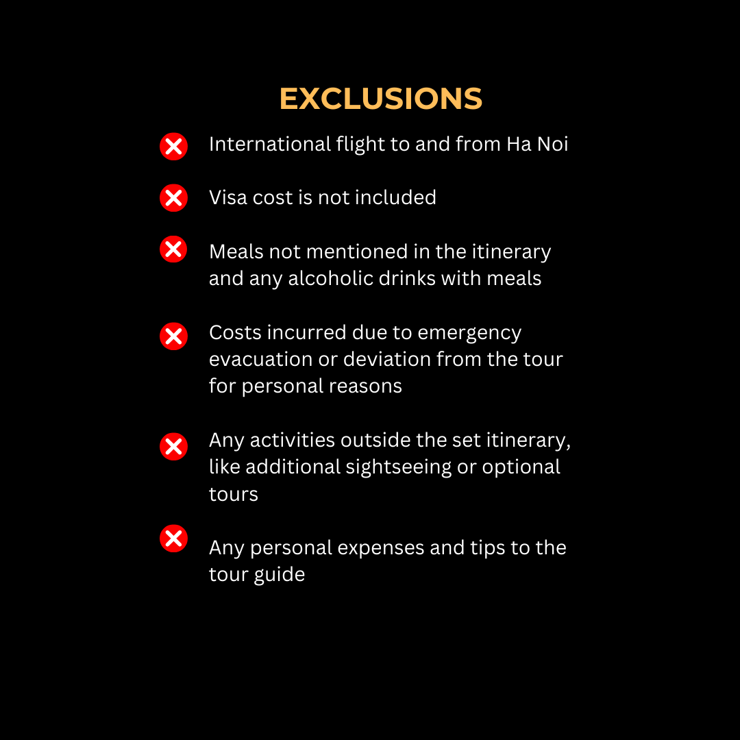 Emergency Evacuation: Costs incurred due to emergency evacuation or deviation from the tour for personal reasons.