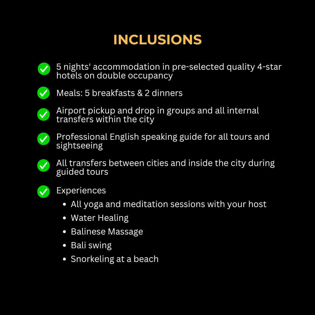 Afternoon: Check out and transfer to the airport, leaving with unforgettable memories, new connections, and a heart full of Bali’s peace and beauty.