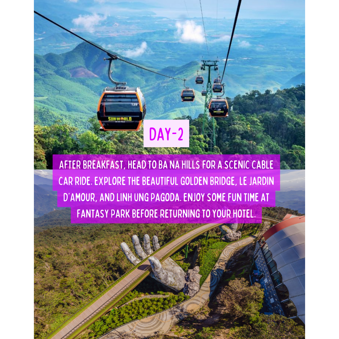 - Ba Na Hills: Cable car ride, visit Le Jardin D’Amour Flower Garden, Golden Bridge, Linh Ung Pagoda (tallest Buddhist statue in Vietnam).