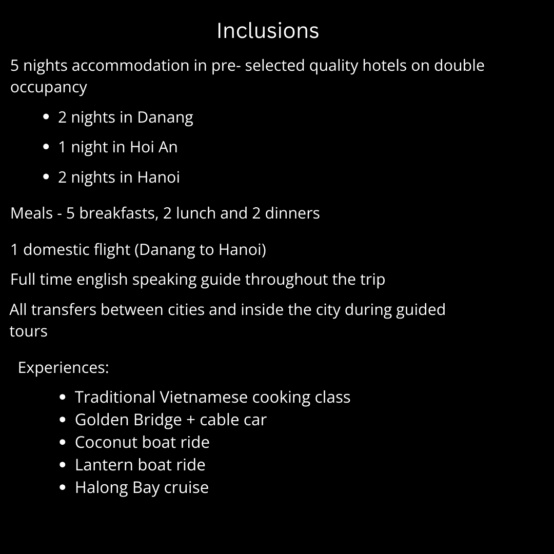 - Transfer to Danang Airport for your evening domestic flight to Hanoi.