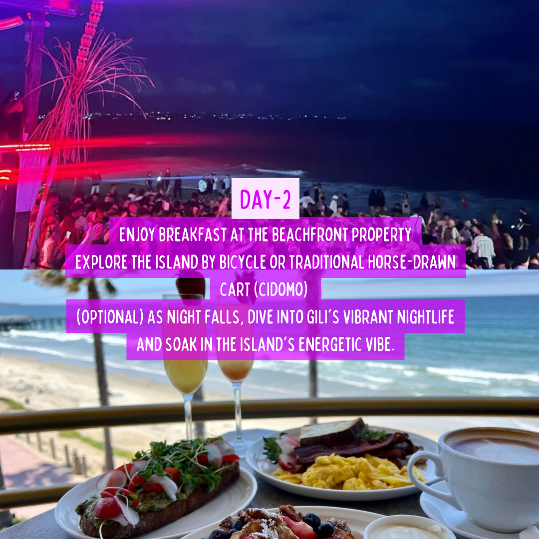Optional- As night falls, dive into Gili's vibrant nightlife at one of its top beach clubs, where you can dance, sip cocktails, and soak in the island's energetic vibe.