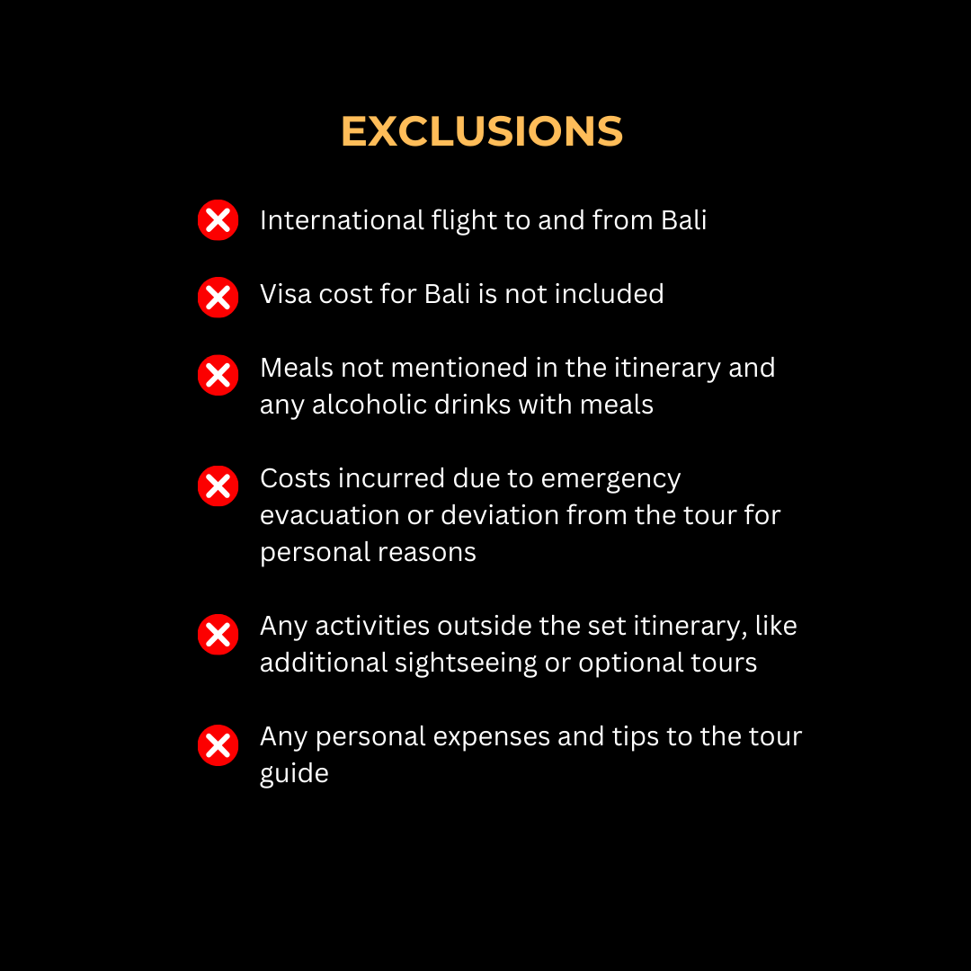 Emergency Evacuation: Costs incurred due to emergency evacuation or deviation from the tour for personal reasons.